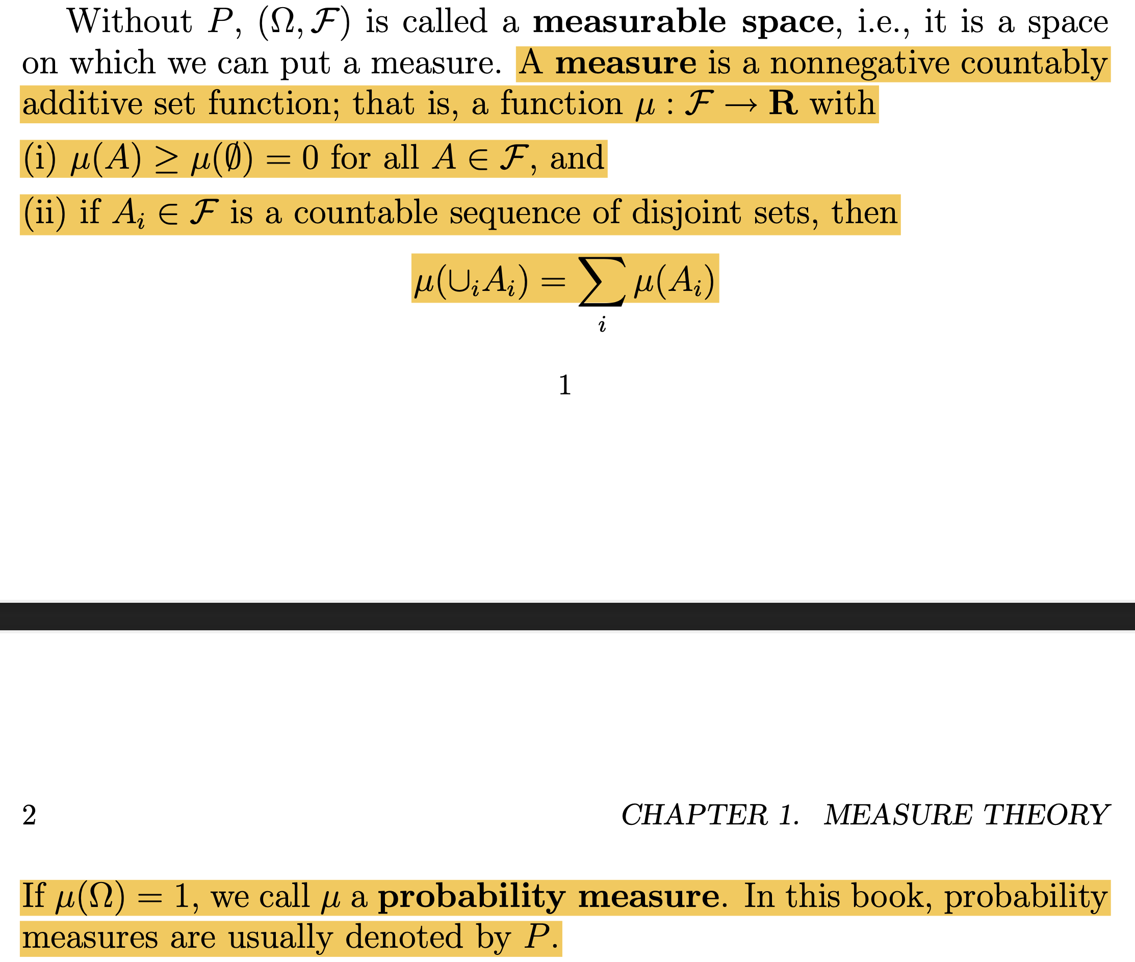 - 확률의 정의: 메져(measure)는 길이따위를 일반화한 개념이다. 확률은 메져의 특수한 형태이다.4메져와 확률은 아래와 같이 정의한다.