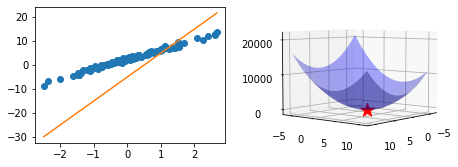 ax2.scatter(2.5,4,torch.sum((y-2.5-4*x)**2),s=200,color='red',marker='*') ## 최소점을 표시하는 코드 (붉은색 별)
