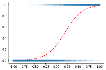 y = torch.bernoulli(v) plt.scatter(x,y,alpha=0.05)
