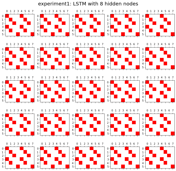 fig.suptitle("experiment1: LSTM with {} hidden nodes".format(HIDDEN),size=20)