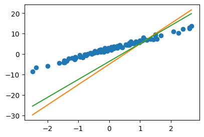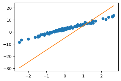 y = x * 4 + 2.5 + epsx[:5], y[:5](tensor([-2.4821, -2.3621, -1.9973, -1.6239, -1.4792]),