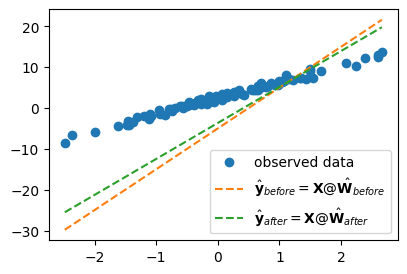 print(f"loss: {(y - X@What).T @ (y - X@What)}")loss: tensor([[55.0740]])