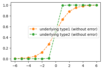 plt.plot(x,torch.exp(x)/(1+torch.exp(x)),'o--', label = "underlying type1 (without error)", color="C1")