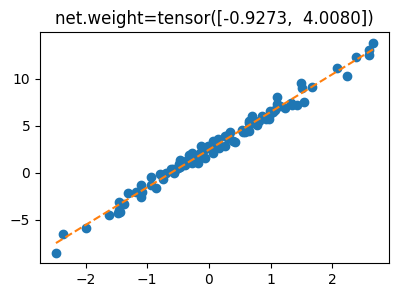 optimizr.zero_grad()net.bias.data, net.weight.data(tensor([2.4290]), tensor([[4.0144]]))