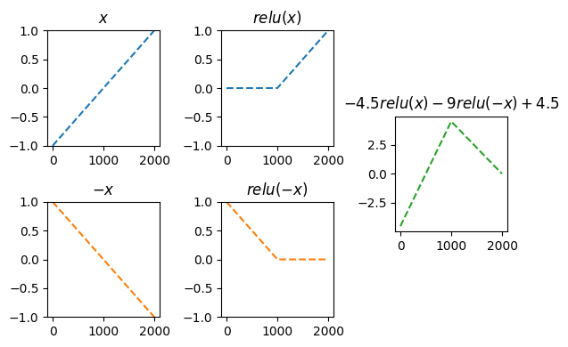 ax5 = fig.add_subplot(spec[1:3,2]); ax5.set_title(r'$-4.5 relu(x)-9 relu(-x)+4.5$')