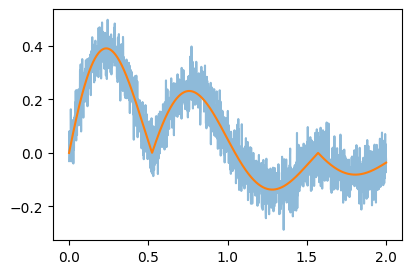 y = fx + epsplt.plot(x,y,label="observed",alpha=0.5)