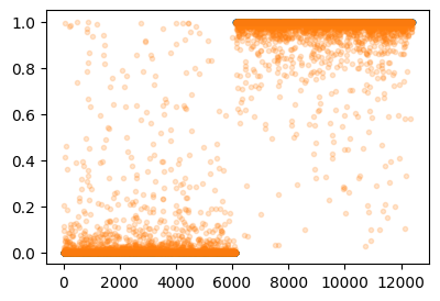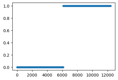 y = torch.tensor([0.0]*len(X3) + [1.0]*len(X7))plt.plot(y,'.')