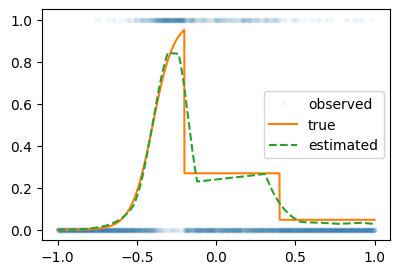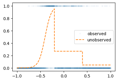 y = torch.bernoulli(v)plt.plot(x,y,'.',alpha=0.03, label="observed")
