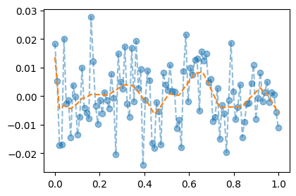 optimizr.zero_grad()plt.plot(x,y,'--o',alpha=0.5)