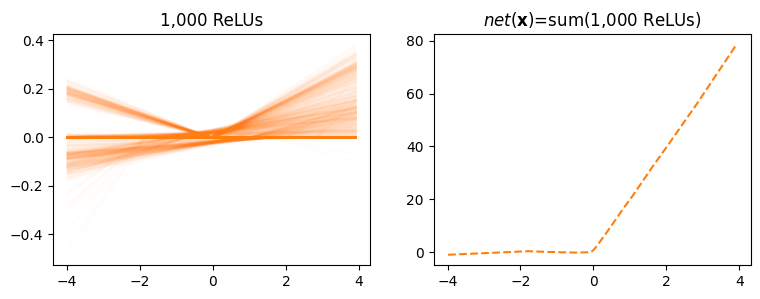 ax[1].set_title(r"$net({\bf x})$=sum(1,000 ReLUs)");