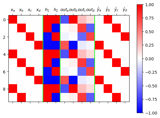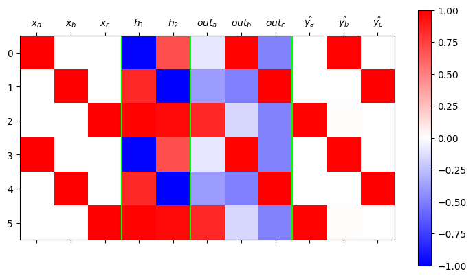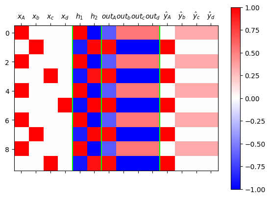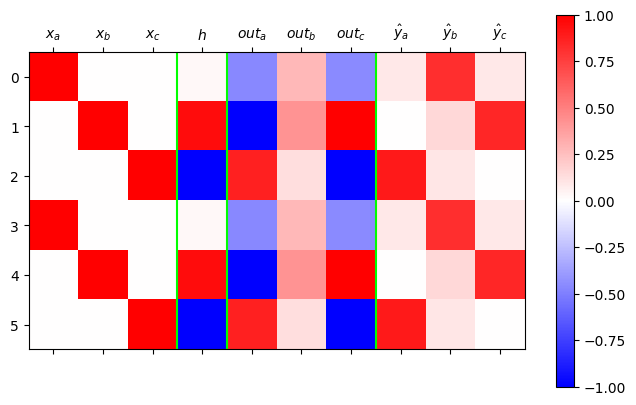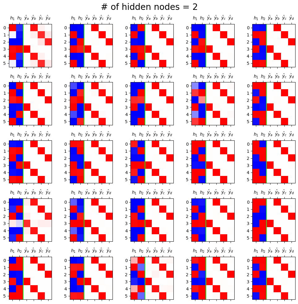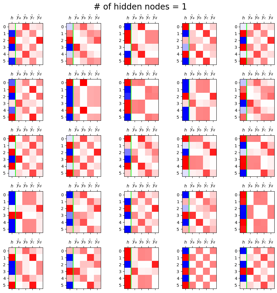 ax[i][j].set_xticks(ticks=[0,1,2,3,4,5],labels=[r"$h_1$",r"$h_2$",r"$\hat{y}_a$",r"$\hat{y}_b$",r"$\hat{y}_c$",r"$\hat{y}_d$"])