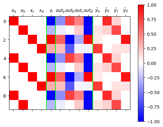 plt.xticks(ticks=[0,1,2,3,4,5,6,7,8,9],labels=[r"$x_a$",r"$x_b$",r"$x_c$",r"$h$",r"$out_a$",r"$out_b$",r"$out_c$",r"$\hat{y}_a$",r"$\hat{y}_b$",r"$\hat{y}_c$"]);