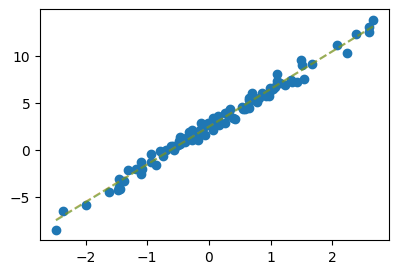 plt.plot(x,2.4459 + 4.0043*x,'--',alpha=0.5) # 회귀분석에서 배운대로 구한값