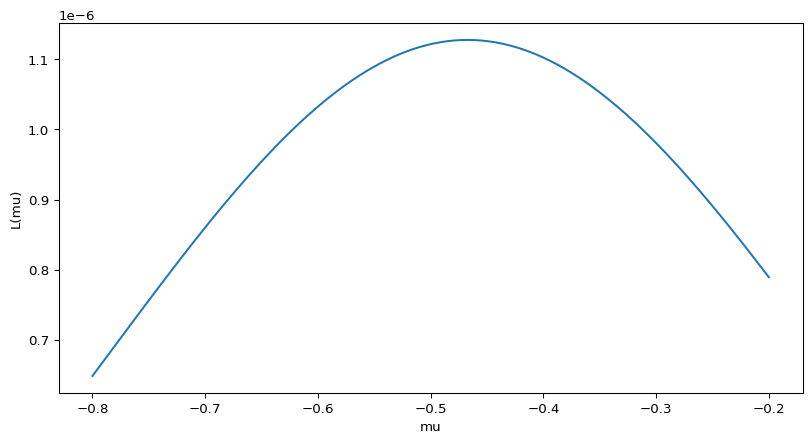 \[L(\mu)=\frac{1}{\sqrt{2\pi}} e^{-\frac{(-1.4805676-\mu)^2}{2}}\times\dots\times\frac{1}{\sqrt{2\pi}} e^{-\frac{(0.4280148-\mu)^2}{2}}\]