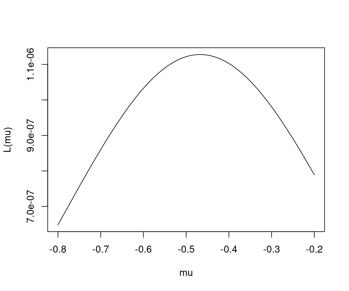 \[L(\mu)=\frac{1}{\sqrt{2\pi}} e^{-\frac{(-1.4805676-\mu)^2}{2}}\times\dots\times\frac{1}{\sqrt{2\pi}} e^{-\frac{(0.4280148-\mu)^2}{2}}\]