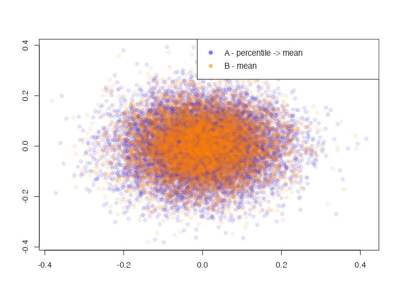 legend("topright", legend=c("A - percentile -> mean", "B - mean"),