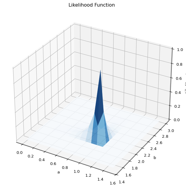 수식을 살펴보면 (1) \(a\leq 1.045556\) 이고 \(b\geq 1.940467\)일 경우만 가능도함수는 \(0\)이 아닌 값을 가지고 (2) 그 값은 \((b-a)\)값이 작을수록 최대가 되므로 \[(a,b)=(1.045556,1.940467)\]에서 이론적인 최대값을 가진다.