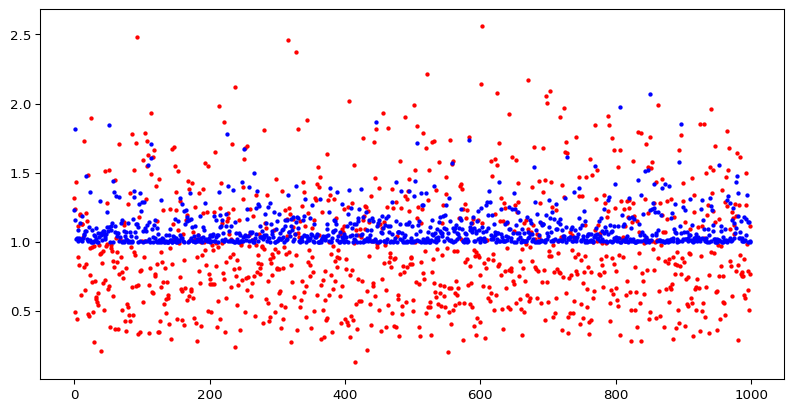 plt.scatter(range(1000), A, c='red', s=5, label='mean(x^2)')