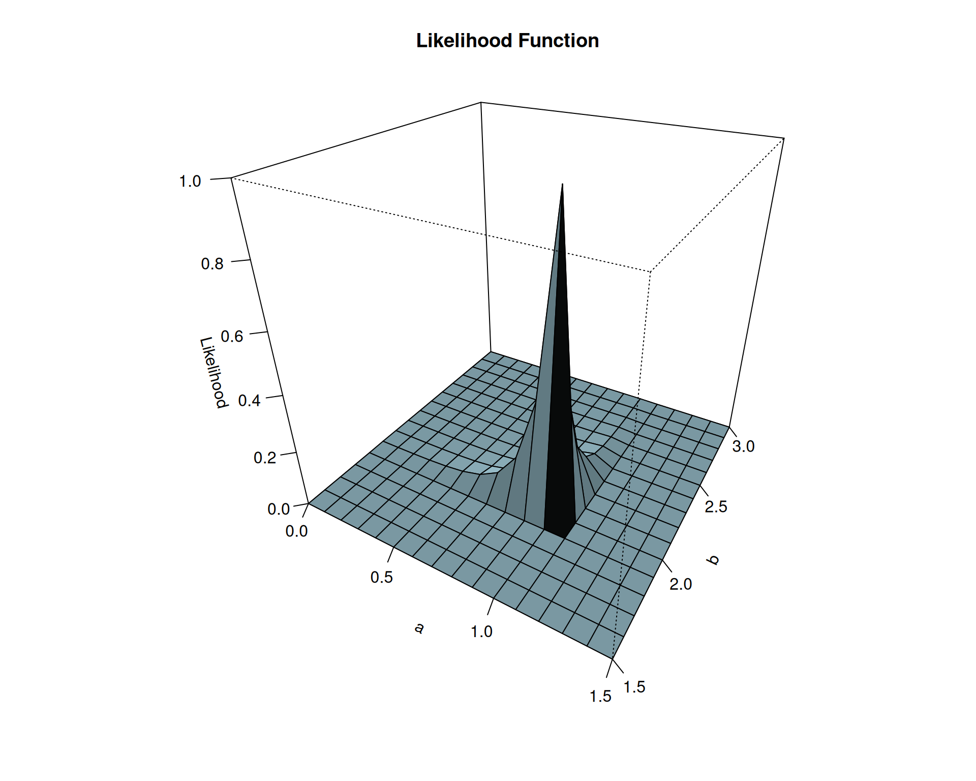 수식을 살펴보면 (1) \(a\leq 1.045556\) 이고 \(b\geq 1.940467\)일 경우만 가능도함수는 \(0\)이 아닌 값을 가지고 (2) 그 값은 \((b-a)\)값이 작을수록 최대가 되므로 \[(a,b)=(1.045556,1.940467)\]에서 이론적인 최대값을 가진다.