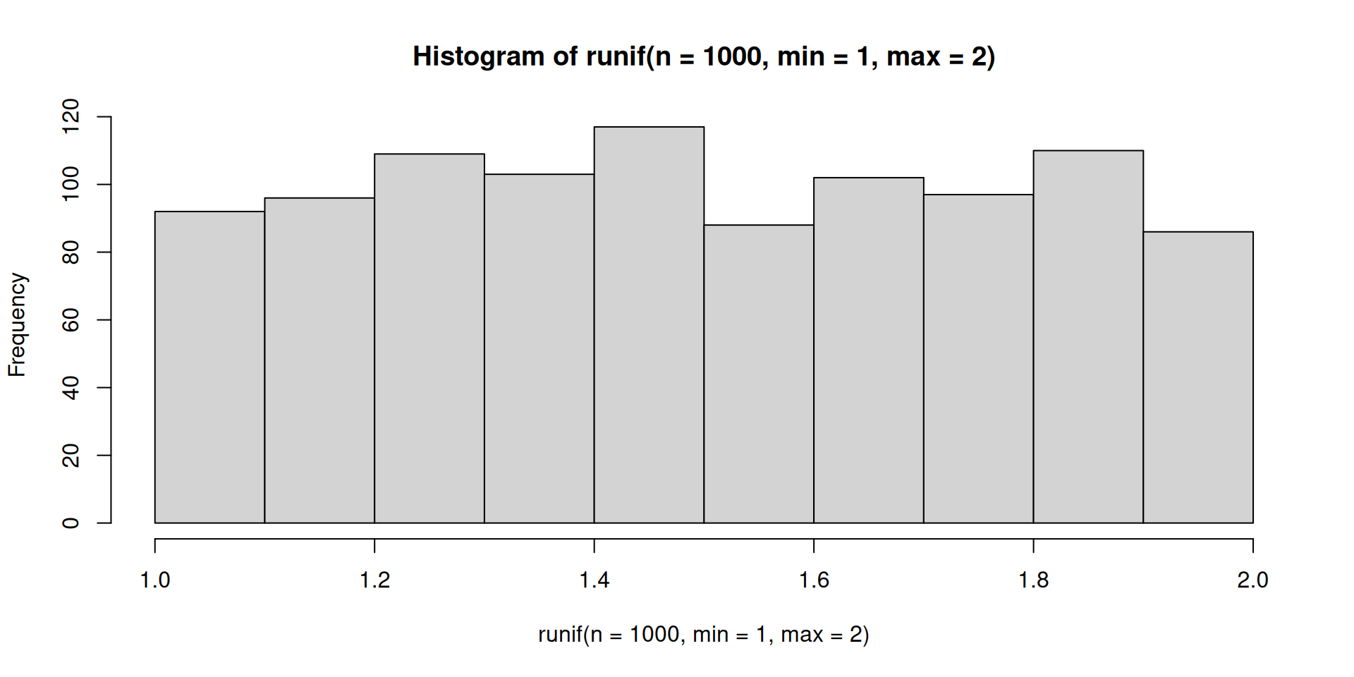 여기에서 \(U\)는 uniform의 약자이다. 히스토그램을 그려보자. (이때 \(a=1, b=2\)를 가정함)