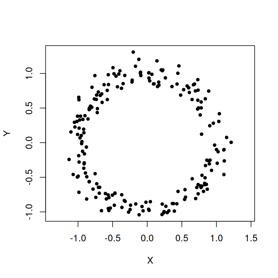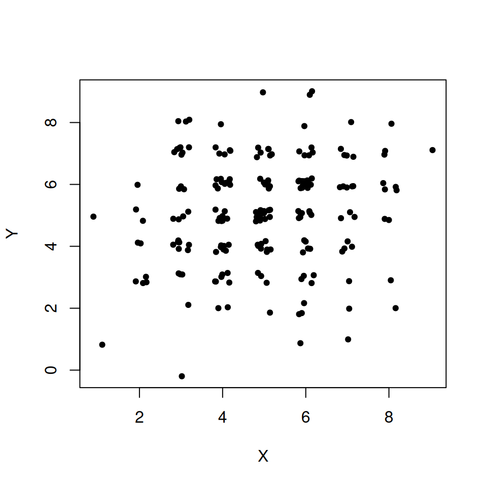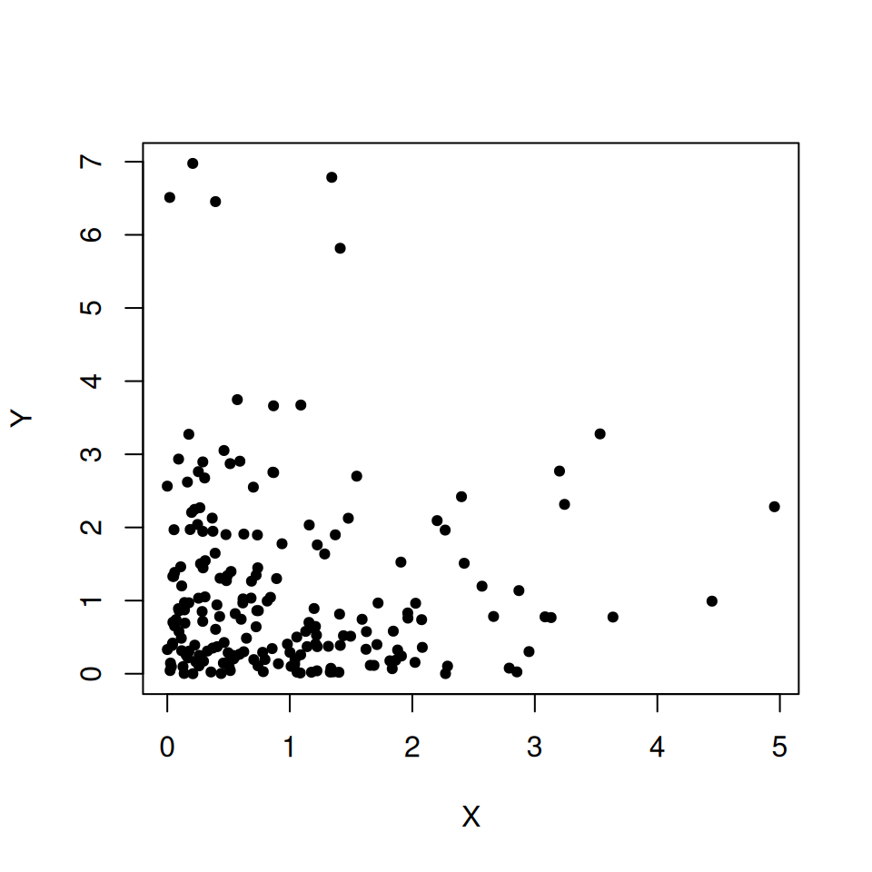 문제45. 아래 산점도는 \((X_i, Y_i)\), \(i=1,\ldots,200\)을 나타낸 것이다. \(X_i\)와 \(Y_i\)는 독립인가?