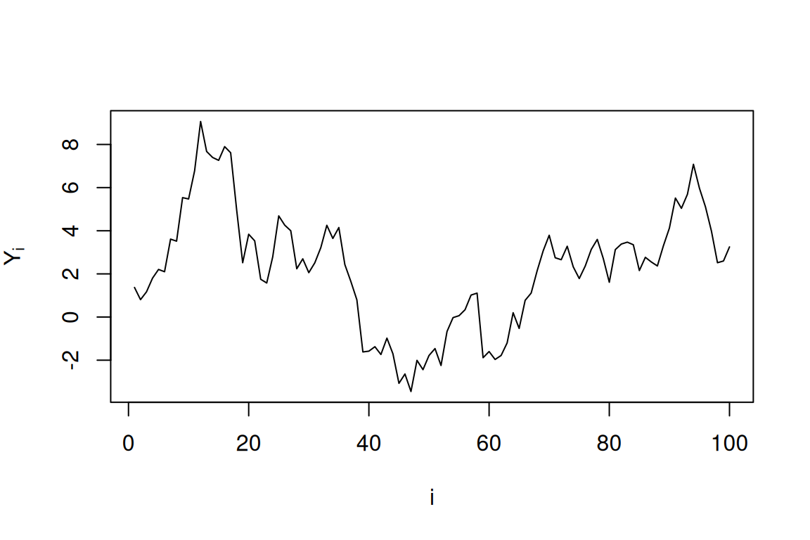 문제39. 아래 그림은 \(Y_1, Y_2, \ldots, Y_{100}\)을 생성하여 \((i, Y_i)\)를 선으로 연결한 것이다. \(Y_i\)들은 서로 독립인가?