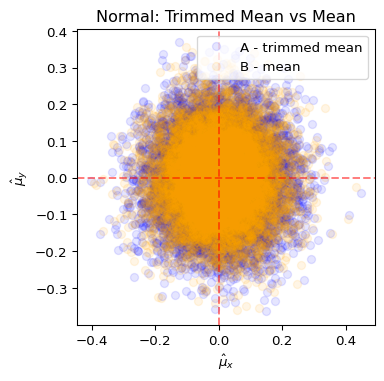 - 위 과정을 \(m\)번 반복하여 \((\hat\mu_x, \hat\mu_y)\)를 산점도로 표시 (따라서 점은 각 방식별로 \(m\)개씩 있음)