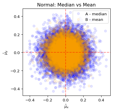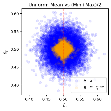 - \(n\)개의 샘플 \(x_1, \ldots, x_{n}\)을 추출하여 A방식과 B방식으로 각각 \(\hat\mu_x\)를 계산