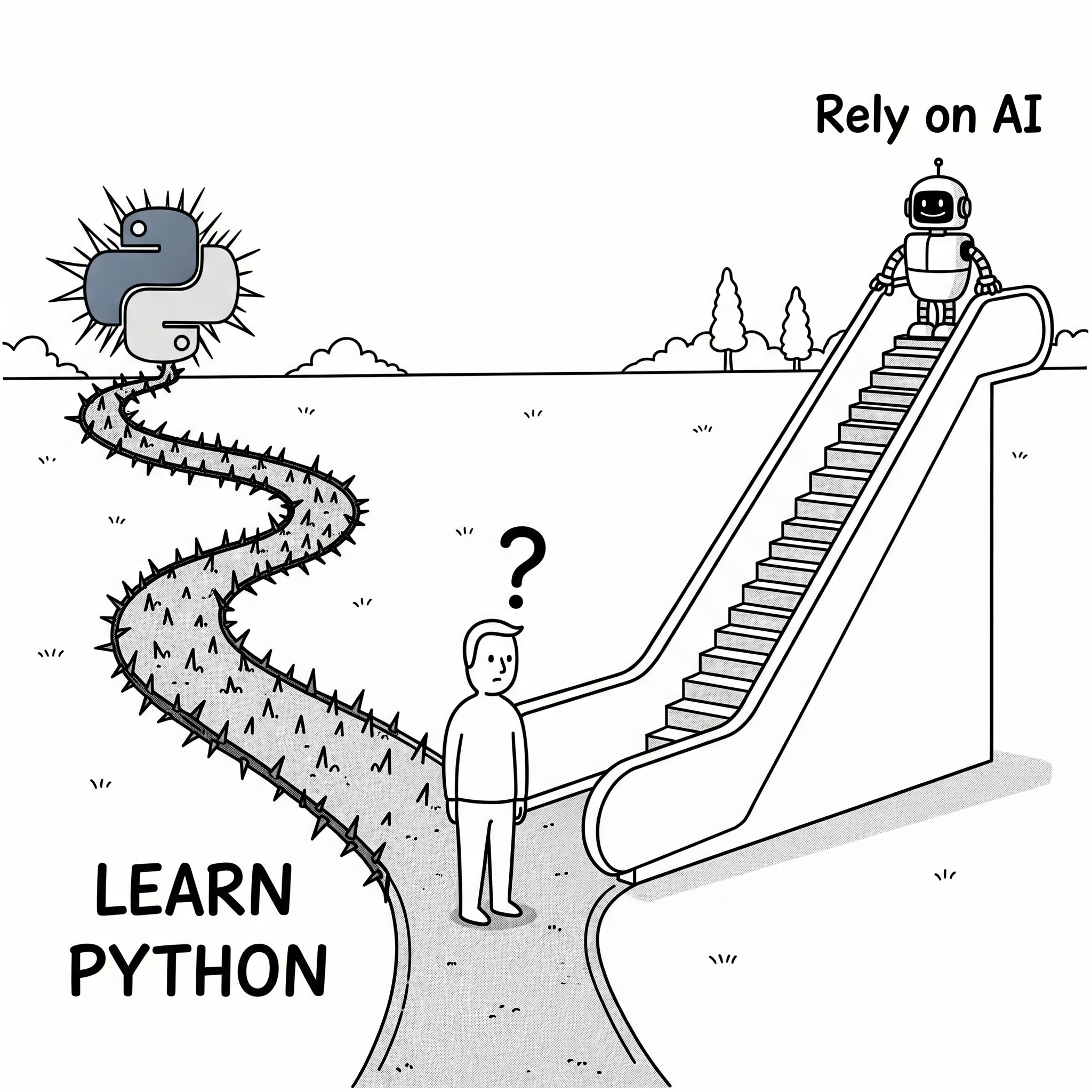 - 왼쪽길: 가장 인기 있는 새로운 프로그래밍 언어는 영어임. 코딩 배울 필요 없음.