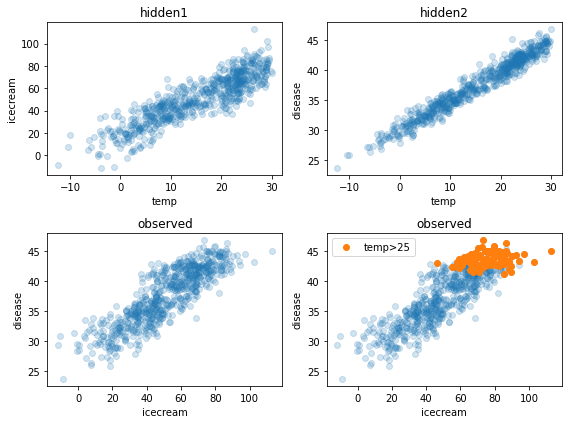 - 해피앤딩: 온도를 통제하니까 아이스크림과 질병은 관련이 없어보인다. \(\to\) 아이스크림을 먹으면 소아마비를 유발한다는 이상한 결론이 나올뻔 했지만 우리는 온도라는 흑막을 잘 찾았고 결과적으로 “온도->아이스크림판매량,소아마비” 이라는 합리적인 진리를 얻을 수 있었다.