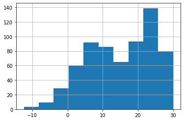 - 온도를 카테고리화 하자 \(\to\) 적당한 구긴을 설정하기 위해서 히스토그램을 그려보자.