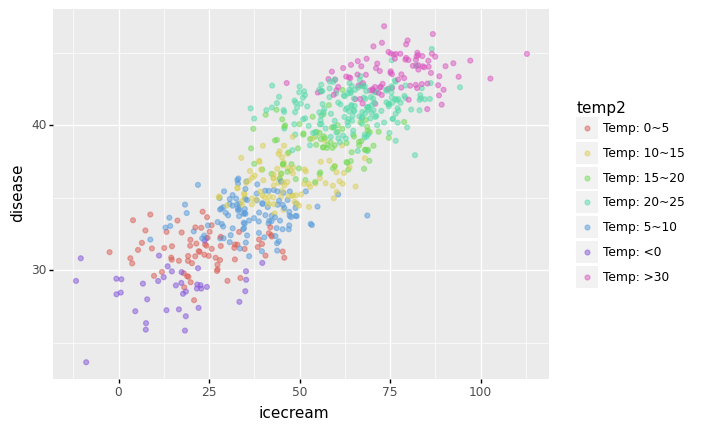 geom_point(aes(x='icecream',y='disease',colour='temp2'),alpha=0.2)+\