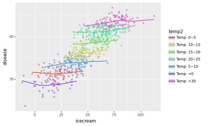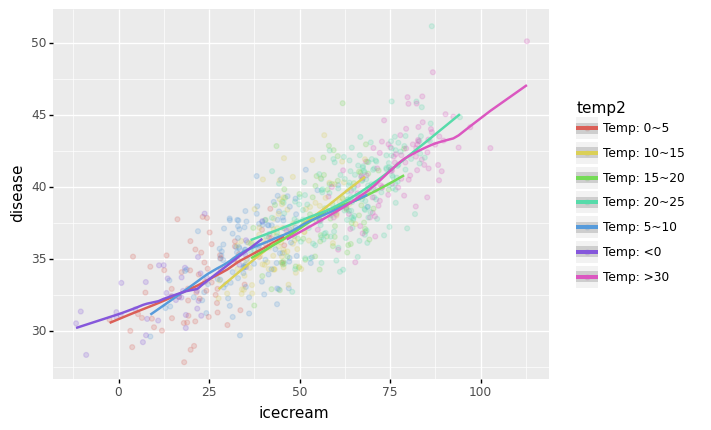 geom_smooth(aes(x='icecream',y='disease',colour='temp2'))/home/cgb4/anaconda3/envs/py37/lib/python3.7/site-packages/plotnine/stats/smoothers.py:311: PlotnineWarning: Confidence intervals are not yet implementedfor lowess smoothings.