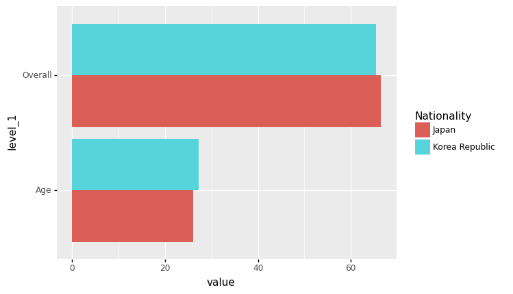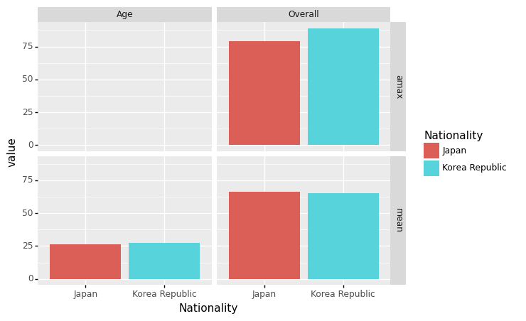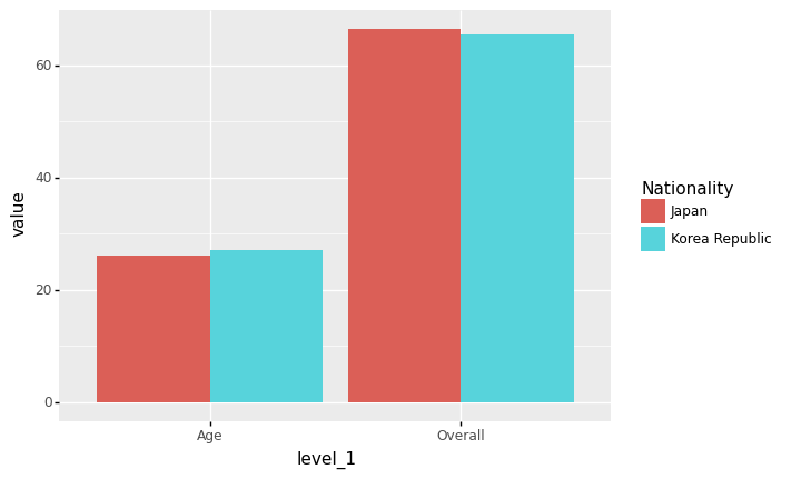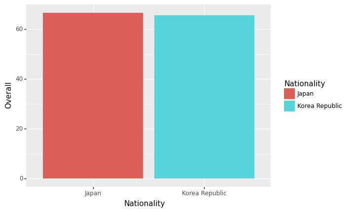 #ggplot(data)+geom_col(aes(x='Nationality',y='Overall',color='Nationality'))