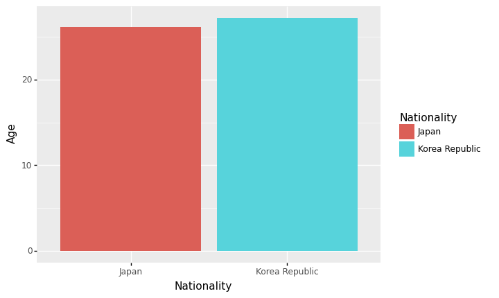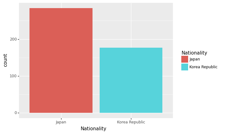 ggplot(df)+geom_bar(aes(x='Nationality',fill='Nationality'),stat='count') # y='..count..' 생략,