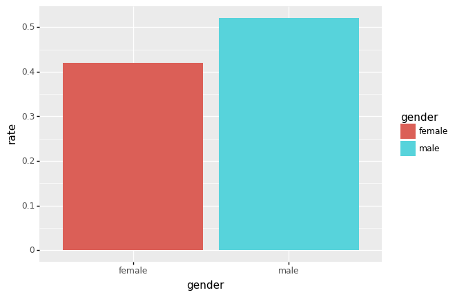 ggplot(data2.query('result=="pass"'))+geom_col(aes(x='gender',fill='gender',y='rate'))\
