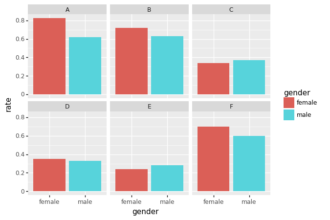 - 살펴보니 합격률이 높은 A,B학과의 경우 상대적으로 남성이 많이 지원하였음. 합격률이 낮은 C,D학과는 상대적으로 여성이 많이 지원함. D,F의 지원수는 비슷