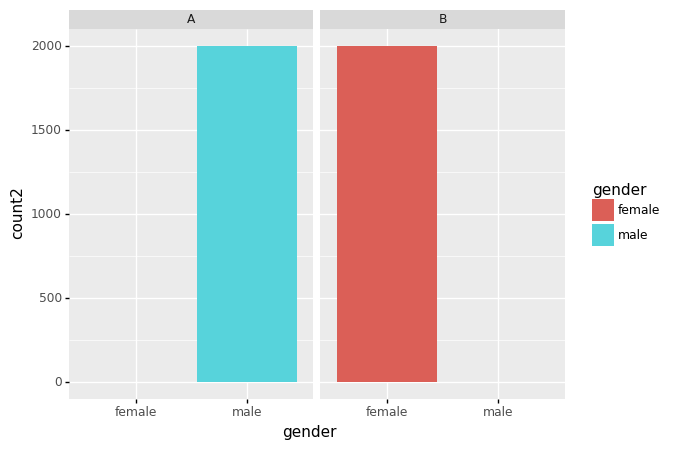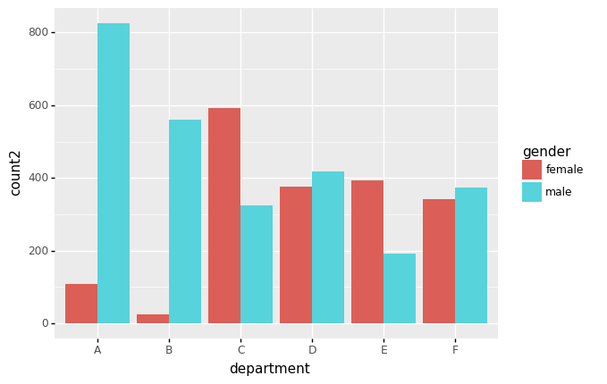 ggplot(data2.query('result=="pass"'))+geom_col(aes(x='department',y='count2',fill='gender'),position='dodge')