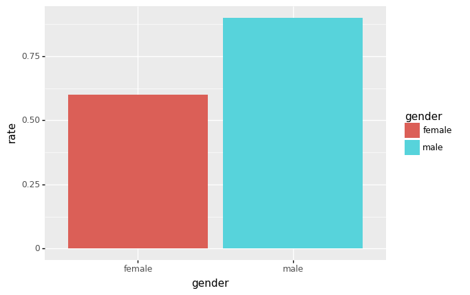 ggplot(data1.query('result=="pass"'))+geom_col(aes(x='gender',fill='gender',y='rate'))
