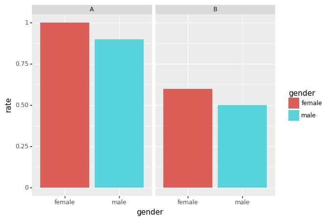 - 교재에서 설명한 이유: 여성이 합격률이 낮은 학과에만 많이 지원하였기 때문