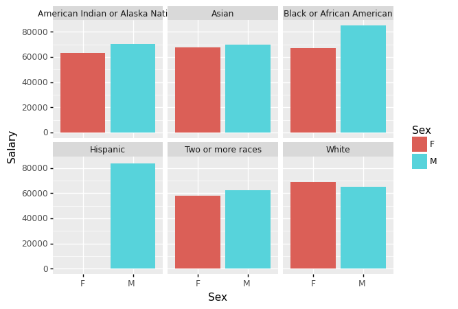 - 성별(Sex)/인종별(RaceDesc) 평균급여(Salary)를 구하고 아래의 지침에 따라 시각화 하라.