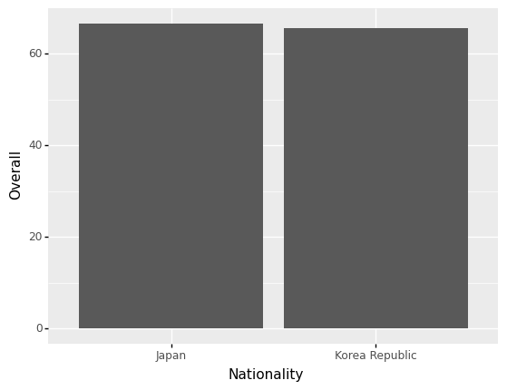 ggplot(data)+geom_col(aes(x='Nationality',y='Overall',fill='Nationality'))