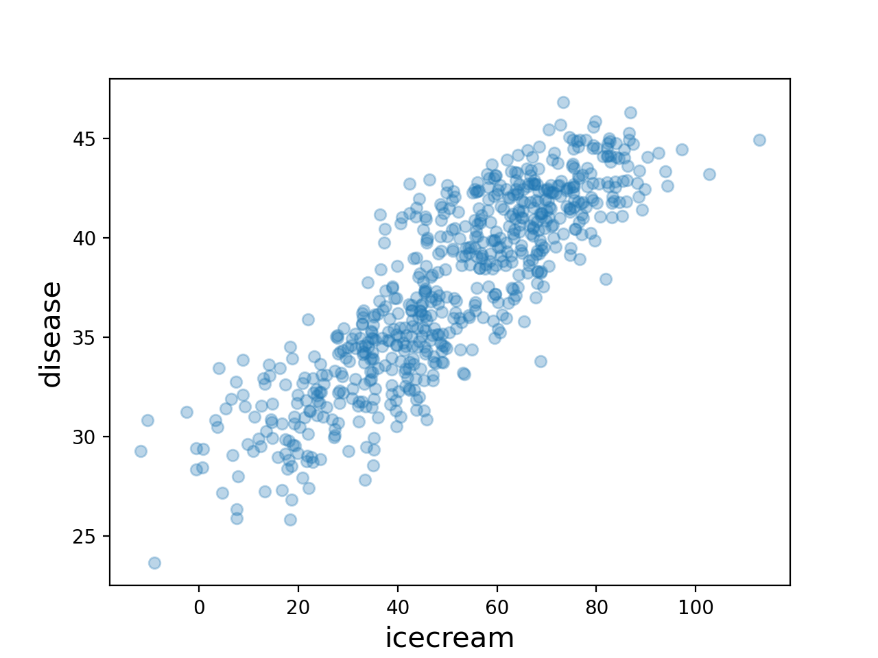 \[{\tt disease}_i =\beta_0 +\beta_1 {\tt icecream}_i +\epsilon_i,\quad \textbf{for} ~~ i=1,2,\dots, 12\]