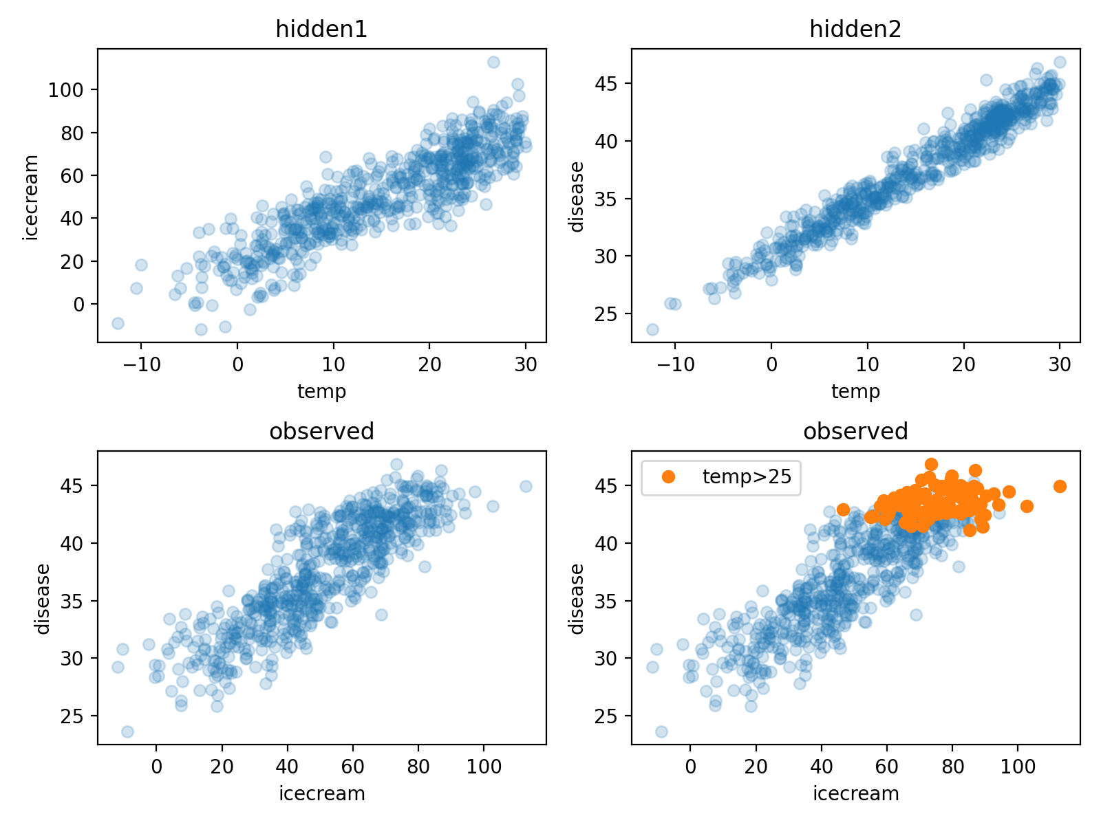 ax4.plot(icecream,disease,'o',alpha=0.2); ax4.set_xlabel('icecream'); ax4.set_ylabel('disease'); ax4.set_title("observed")