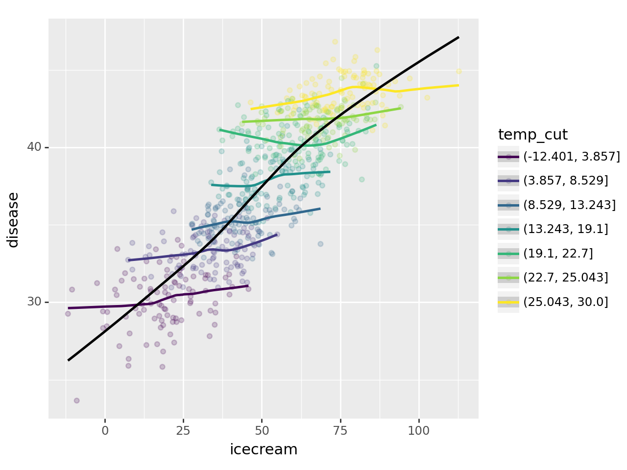line = geom_smooth(aes(x='icecream',y='disease',color='temp_cut'))