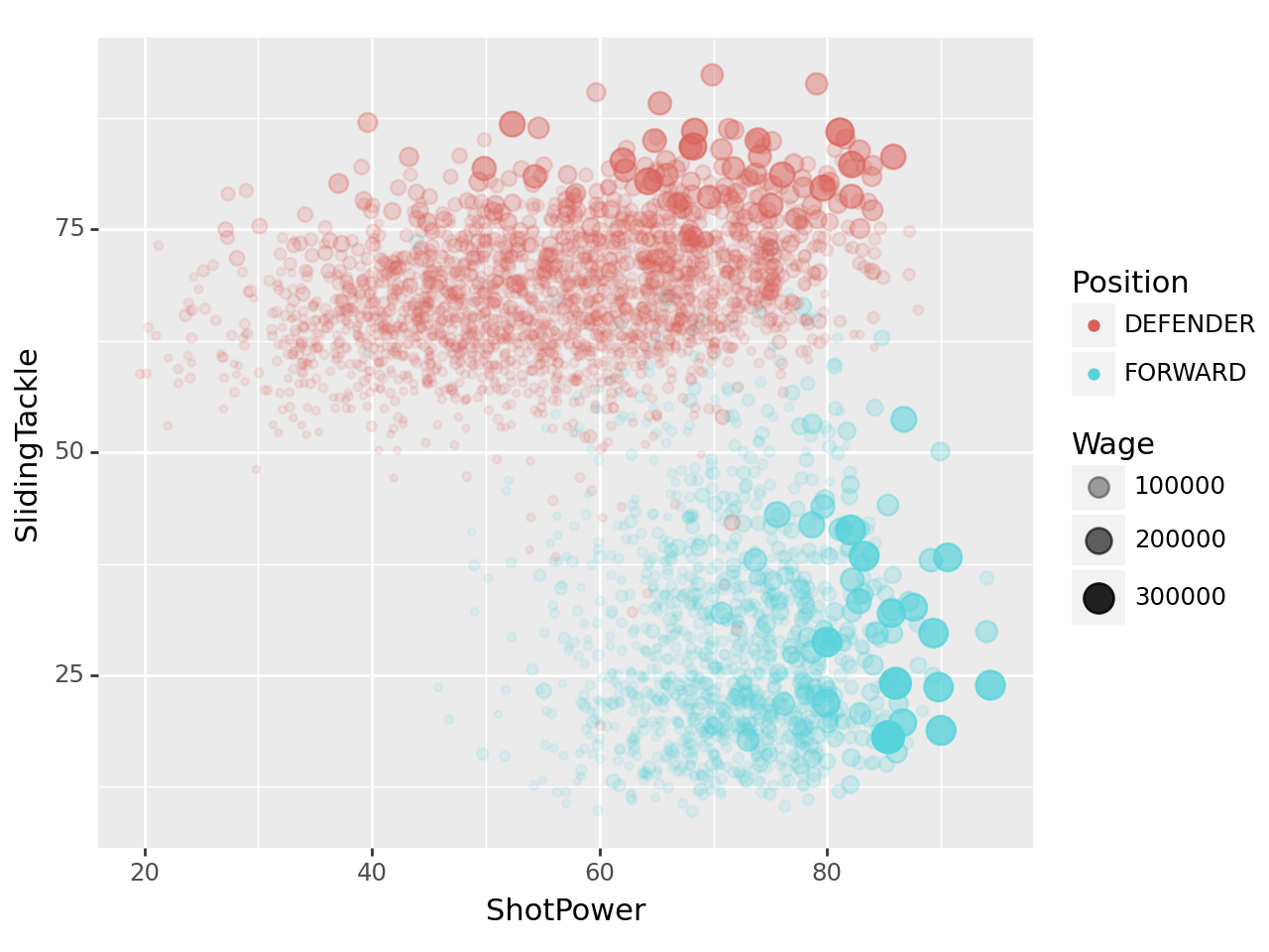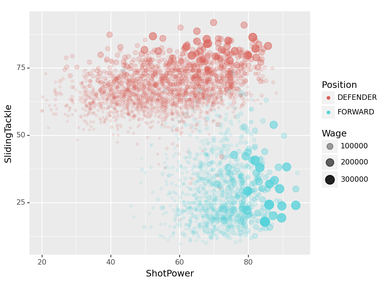E. Position==“DEFENDER” or Position==“FORWARD”에 해당하는 관측치를 고른 뒤 x축에 ShotPower, y축에 SlidingTackle을 시각화하라. 이때 Position은 color로 구분하고 Wage는 size와 alpha로 구분하라.