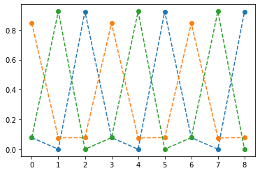 ax[2].plot(yhat[:9],'--o'); ax[2].set_title('$\hat{y}$ = softmax$(net(x))$',size=15);