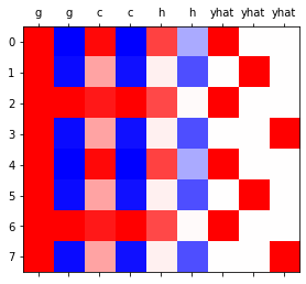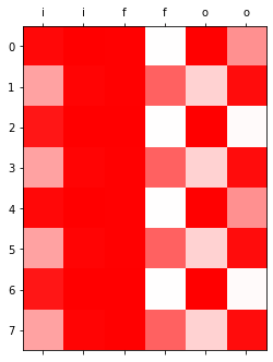 h[[t]] = output_gate[[t]] * tanh(cell[[t]])plt.matshow(combinded1[-8:].data,cmap='bwr',vmin=-1,vmax=1);